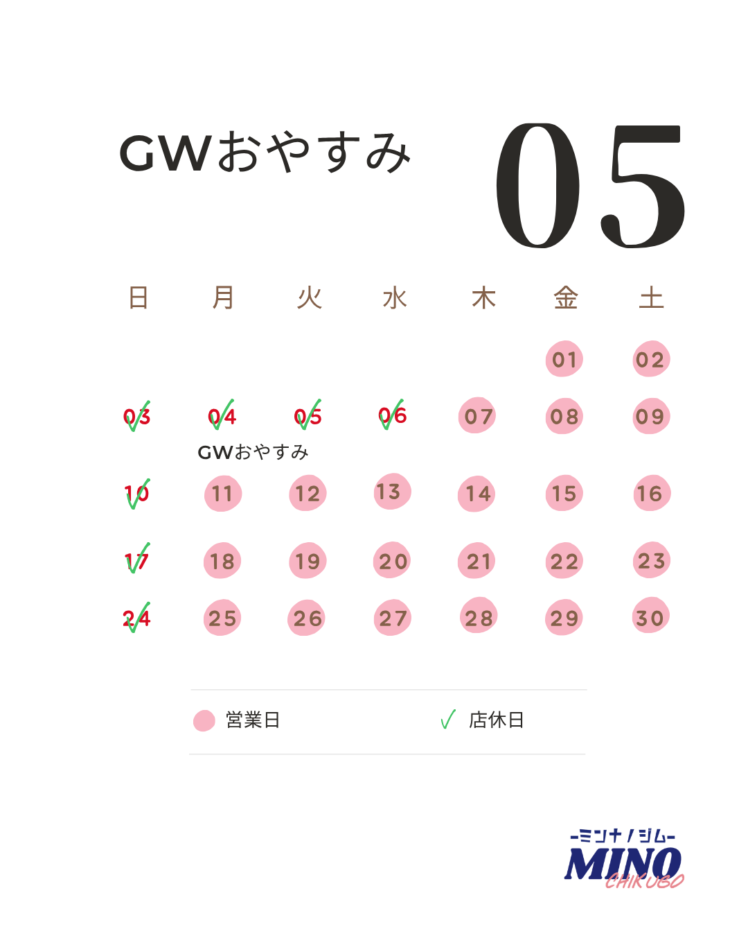 ミンナノジム MINO は下記期間を GW 休館日 とさせていただきます。
